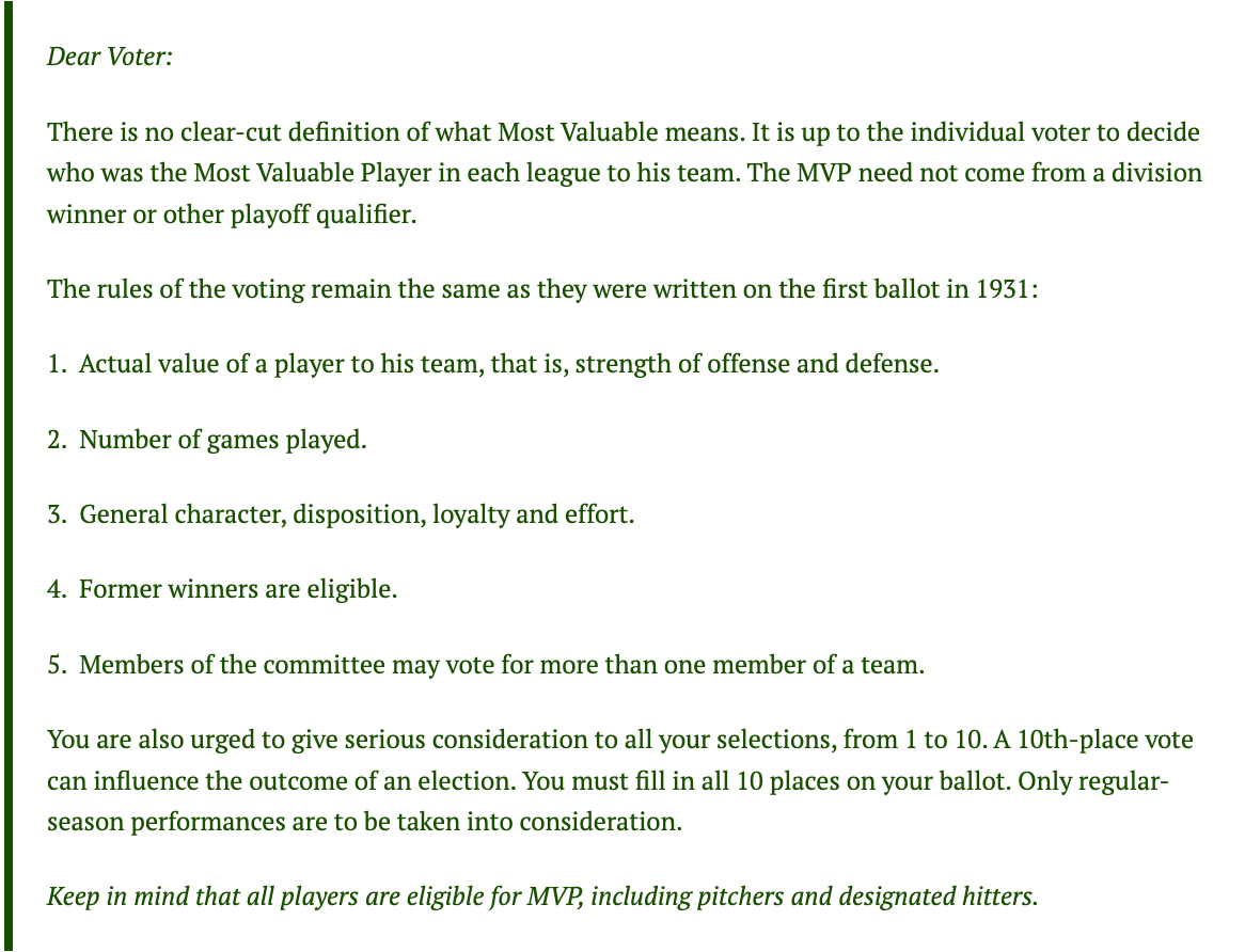 Notice that third point: Those instructions have invited more subjective considerations that recall the Hall of Fame ballot’s infamous character clause. With two writers per team per city voting, the electorate changes from year to year, and so there’s been far less consistency historically than we expect in the age of WAR-driven voting.