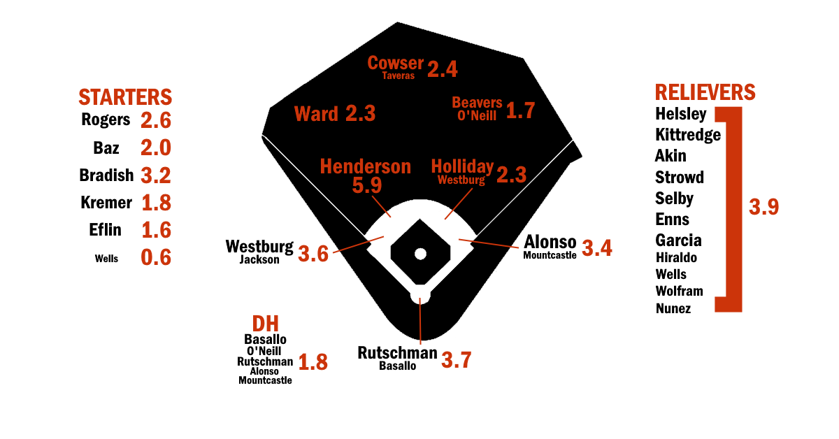 | Kyle Bradish | .225 | .301 | .353 | .225 | .286 | .368 | 2.8 | 1.2 | 2.91 | 4.20 |