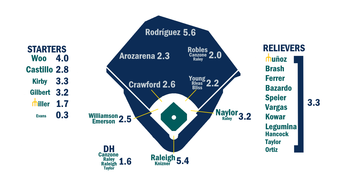 | Bryce Miller | .240 | .305 | .418 | .228 | .282 | .369 | 2.4 | 0.7 | 3.55 | 4.60 |