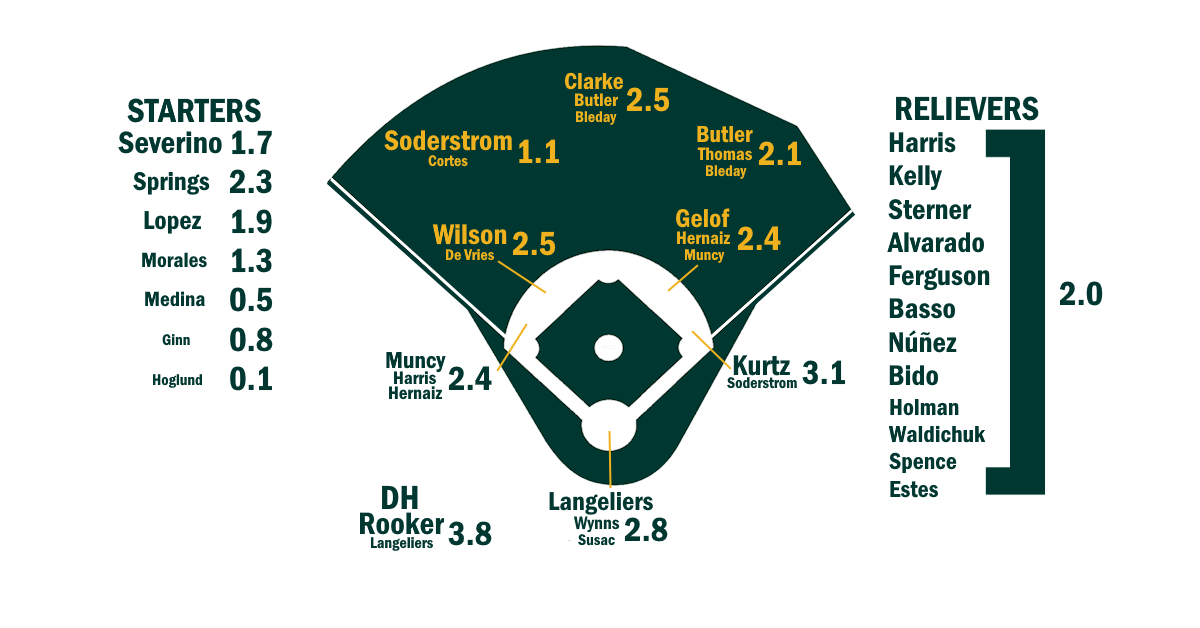 | Ken Waldichuk | .224 | .316 | .353 | .250 | .344 | .429 | 1.0 | -0.2 | 4.23 | 5.61 |