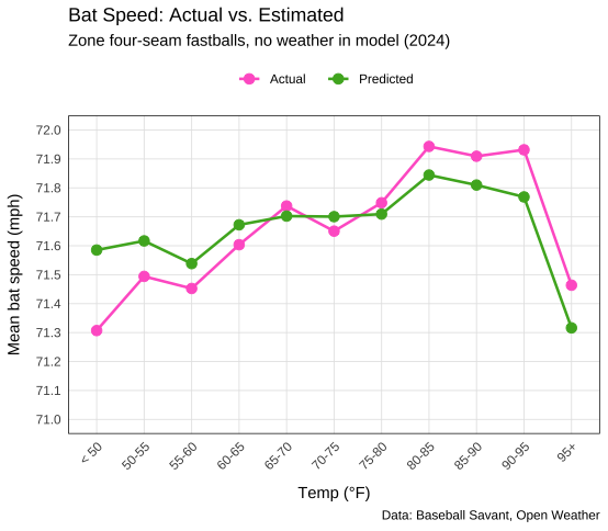 We can also see that, yeah, temperature matters. In the cold, bat speed was slower than expected. In the heat, bat speed was faster than expected. In the middle, it was as expected. Again, I think this makes sense.