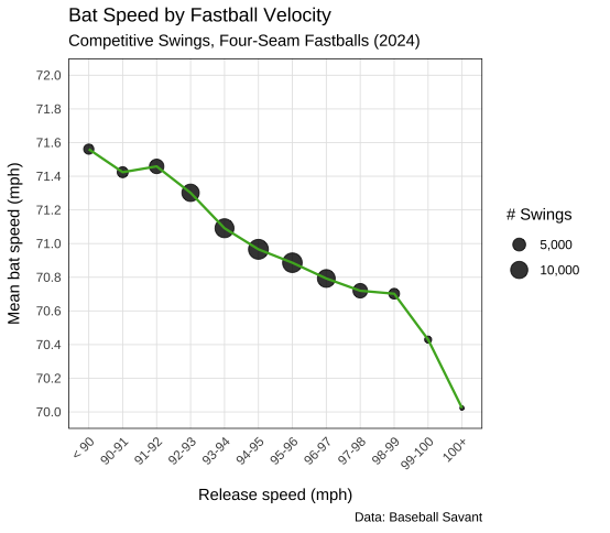 There’s a strong inverse correlation between bat speed and squaring up the ball. I’m guessing that batters don’t swing as hard at faster pitches to increase their bat control and ability to make solid contact.