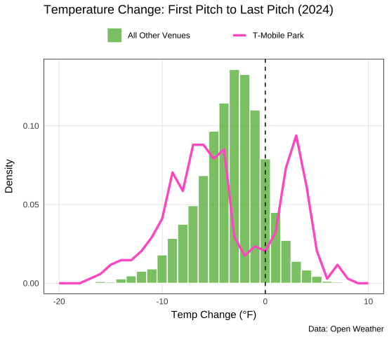 Open Weather data is recorded hourly, which is important. Temperature tends to change throughout a game, from 10-degree drops at night to 10-degree gains during the day. The game-time temperatures provided by MLB don’t capture this. For example, here’s how T-Mobile Park changed between the first and last recorded temperatures of a game: