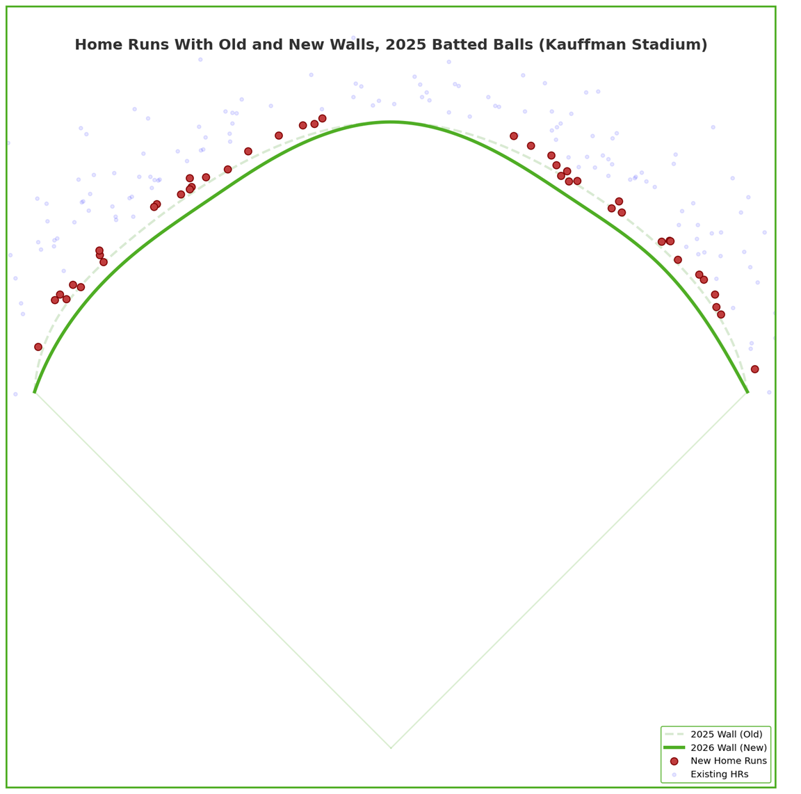 Well, kind of directly. The new dimensions definitely help fly balls. By my estimation, 24 fly balls that didn’t leave Kauffman in 2025 would have been home runs with the new walls. But 19 line drives that didn’t leave the park in 2025 would have gone out as well. Now, to be sure, the line drives were far more productive than the fly balls with the old wall configuration, so the upgrade to fly ball value is real. But line drives are getting more valuable, too. And while the new dimensions will reduce the area outfielders need to defend, Kauffman will still boast meaningfully more outfield square footage than average, so the days of gappers and speed are hardly over.