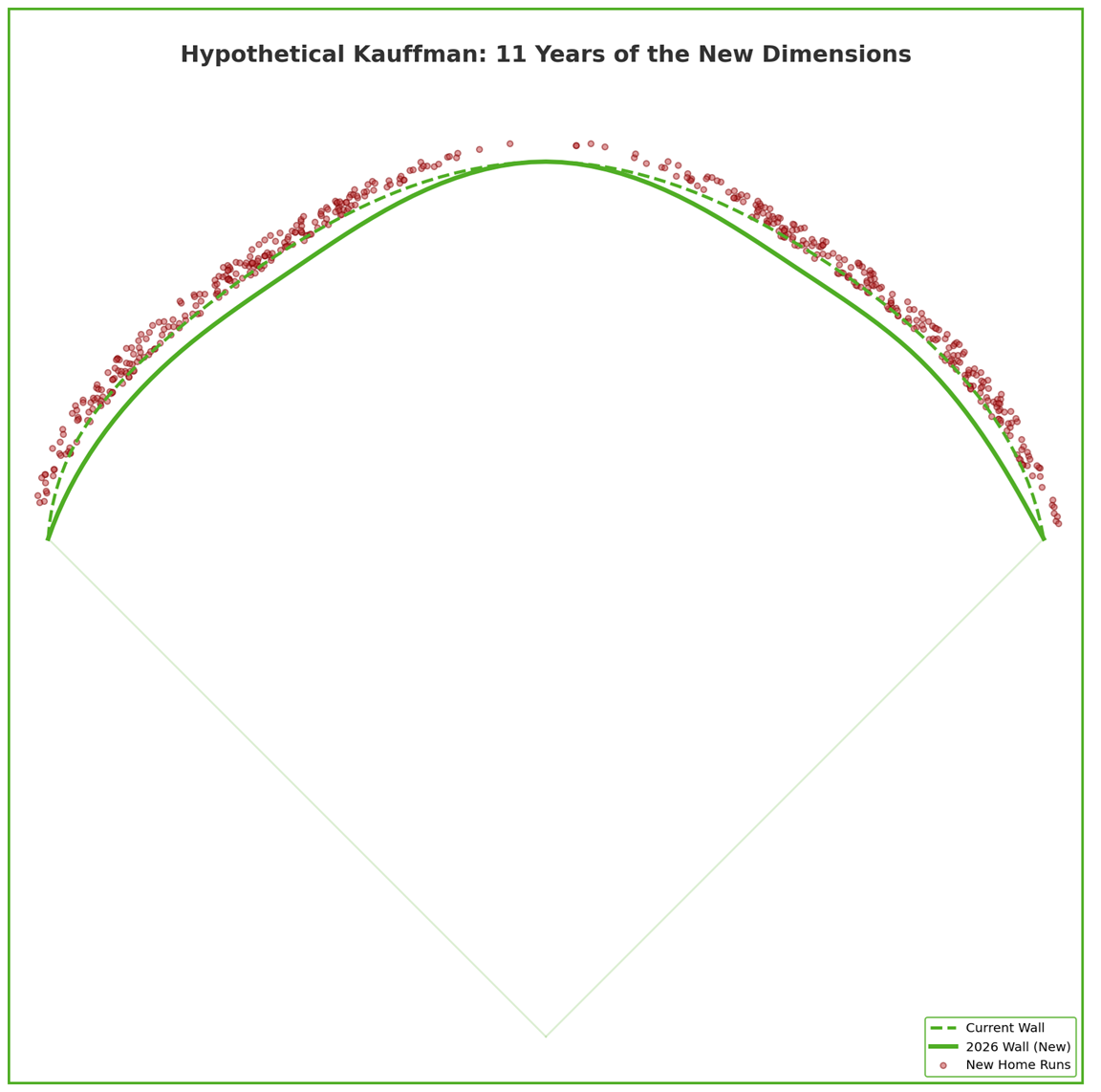 The reason that none of the dots are right at the new wall is that you have to clear it, and the distances I’m using are projected landing points. But you get the idea; pull the walls in everywhere other than center, and you’re going to get a ton more home runs everywhere other than center. The few straggling dots in the middle are the odd beneficiaries of the lower walls.