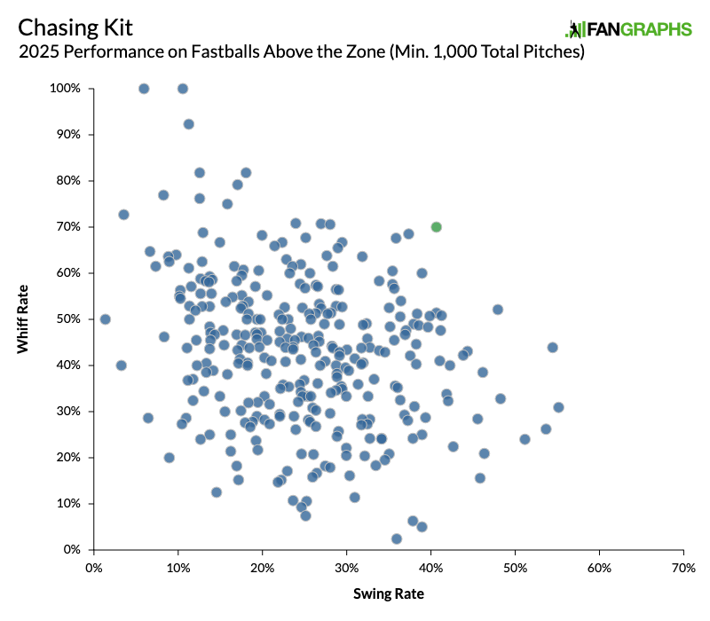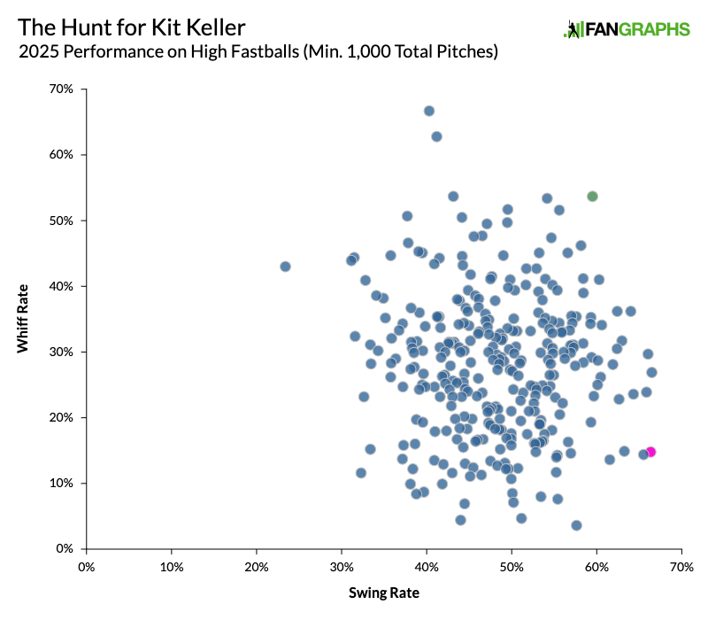 It might be a surprise that the guy who swings at the most high fastballs turns out to be great against them, but the relationship between swing rate and whiff rate on high fastballs is extraordinarily weak. In 2025, among the 308 players who saw at least 1,000 total pitches, the correlation coefficient is -0.07. The graph below shows what that looks like. Naylor is the pink dot in the bottom right, and Luis García Jr. of the Nationals is right next to him. I’ve also highlighted the actual Kit winner on this graph and the next one, but what I really want you to note is the overall shape of the scatter plot.