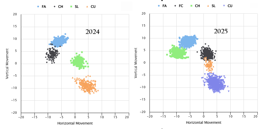 The most relevant developments for Baz in 2025 were that the Rays reintroduced a third breaking pitch to his repertoire, and that he proved he can sustain upper-90s velocity across a starter’s load of innings. His fastball averaged 97 mph, which was in top 10 among qualified starters. Baz has always had a deep mix of breaking balls, but at points his repertoire has been changed or pared down in an effort to help him throw strikes. In 2025, he was throwing more explicit cutters than in 2024, a pitch more apt to finish in the top of the strike zone and play well with Baz’s best bat-misser, his elevated fastball. You can see those cutters (in black) have more vertical movement than the gyro-style sliders he was working with last year: