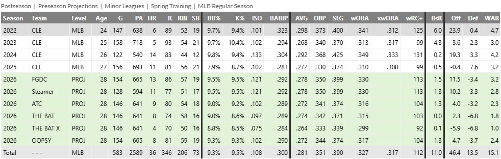 : Can you help me understand why the 2026 projections on Steven Kwan’s Fangraphs page project him with a negative dWAR? I assume there is a large negative positional adjustment for playing LF, but shouldn’t the projections take into account his previous years?