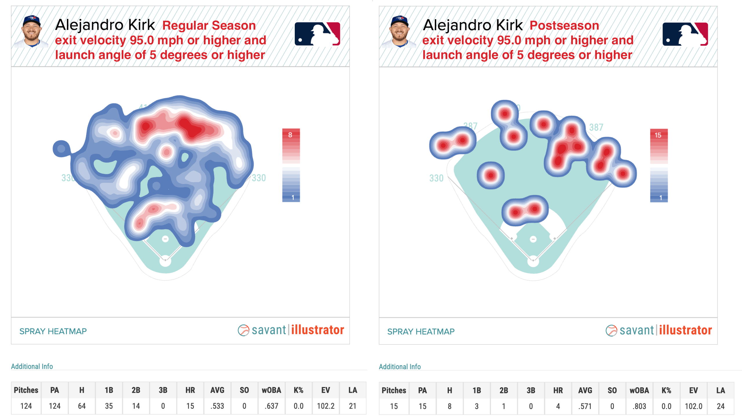 As you might surmise from those increasing launch angles, Kirk has lowered his groundball rate, from 50.2% in 2023 to 45.3% in ’24 to 44.2% in ’25; during the postseason, it’s at 31.8%. He did fall 70 points short of his expected slugging percentage during the regular season, at least in part because when he hit the ball in the air, he tended to hit it to center field. This postseason, he’s sprayed those hard-hit fly balls around the outfield more, and as a result, his SLG and xSLG are less than 10 points apart.