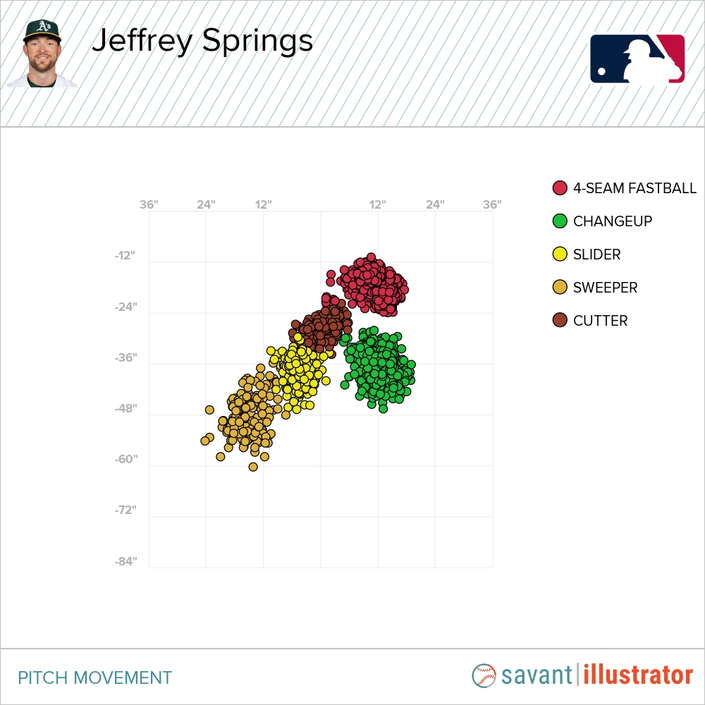 Holmes and Springs are wildly different as pitchers, but they share an ability to work laterally. His last season as a reliever, Springs threw a four-seamer with some rise and arm-side run, along with a changeup to lefties and a slider to righties. He’s tinkered a little with adding some other pitches, but that’s still the core of what he’s about. You can see here the broad variety in horizontal movement among the pitches he throws: