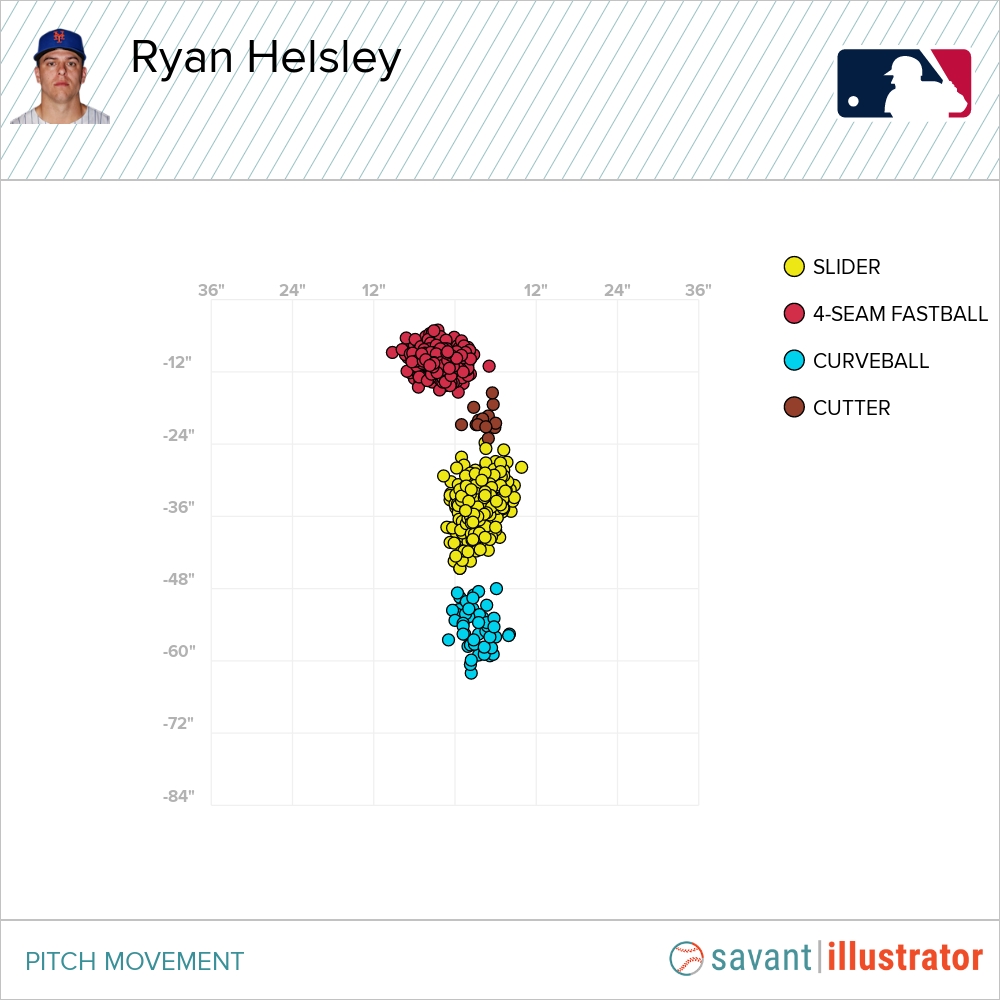 If you wanted to, you could describe both Helsley and pre-2025 Holmes as fastball-slider guys, but that’d be so misleading as to be mischievous. In contrast to the three-quarters arm angles used by Holmes and Springs, Helsley comes over the top. His fastball has more cut to it than anything, and his slider — rather than whirling away from righties — goes straight down the elevator shaft:
