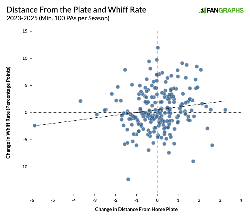 Everything I just laid out has been rolling around my brain for a couple weeks now, along with one other data point: Over the last two seasons, as he’s gotten farther and farther from home plate, Arias’s whiff rate has increased. I finally started wondering whether there was some causation going on after all. Maybe moving closer to the plate really does allow you to make more contact, and moving away from it results in more whiffs. To check, I compared the year-over-year stats. I pulled data for each batter with at least 100 plate appearances in two consecutive seasons, which left us with a sample of 221 sets of two player-seasons for comparison. That way, we’re comparing each player only to himself and getting rid of as many biases as we can. For our purposes, switch-hitters counted as two different players from either side of the plate. Because we only have second-half data for 2023, the vast majority of our sample sets are comparing 2024 numbers to 2025 numbers.