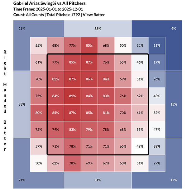 After watching the movie, I did some research to find out which current major leaguer suffers from the worst case of Kit Keller Syndrome. Kit Keller Syndrome is a serious condition that affects thousands of Americans, and it’s associated with two debilitating symptoms: the inability to hit high fastballs, and the inability to lay off ‘em. (There’s also anecdotal evidence that suggests it also causes an innate, deep-seated resentment of Geena Davis). My search led me to Gabriel Arias of the Guardians, but it left me slightly unsatisfied. It’s true that Arias chases and misses high fastballs at a shockingly high rate, but it’s not because he’s particularly susceptible to that one pitch. He runs one of the highest overall chase rates in the league and the absolute lowest overall contact rate. He’s an equal opportunity hacker. He swings at high pitches. He swings at low pitches. He swings at inside pitches. He swings at – well, he actually swings just a bit less at outside pitches, and there’s an obvious reason for that.