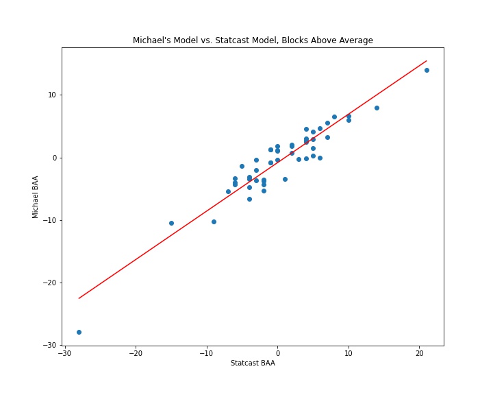 What I do have access to, however, is Python, and a just-good-enough knowledge of machine learning techniques. I started with pitch location, release position, pitch movement, and velocity as my predictor variables. At first, it was terrible. But after some trial and error, I landed on a CatBoost framework, and the resulting model came surprisingly close to reproducing Tango’s model. While it slightly underrated the likelihood of wild pitches, it nonetheless correlated nearly identically with the Savant leaderboard at the individual catcher level (0.9 r-squared).