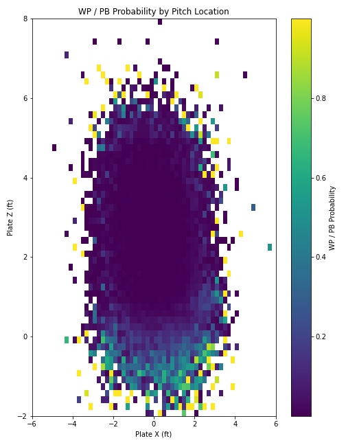 Wells is a decent blocker, but he is far from the best. That honor goes to Alejandro Kirk, who excels not just at limiting mistakes, but also wrangling unruly breaking balls in the dirt. As this plot shows, the highest probability wild pitches/passed balls live down there: