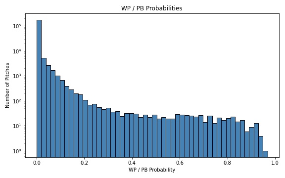 Once I had a good-enough approximation, I set out to better understand the spectrum of wild pitch/passed ball probabilities. Out of nearly 200,000 pitches with runners on base in the sample, just 198 graded out as both a) having a less than 1% chance of being a wild pitch or passed ball, and b) ultimately becoming a wild pitch or passed ball. Here is the general distribution: