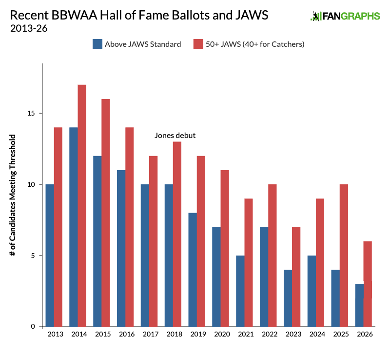 As The Athletic’s Jayson Stark pointed out last week, in the last 12 cycles before this one (2014–25), BBWAA voters elected 18 first-year candidates, the most of any 12-year span in Hall history. The only cycles within that span that lacked one came in 2021, when the writers didn’t elect anybody, and ’23, when Rolen, a sixth-year candidate, was the only honoree.