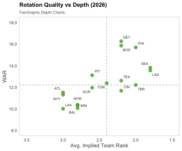 Still, some teams appear to have more depth than others. To find out who, I whipped out my trusty sledgehammer. There are five slots for each team, or 150 slots across the league; the first 30 are ones, the next 30 are twos, then threes, fours, fives, and everything after 150 is a six. The hard cutoffs make this kind of goofy — there is effectively no difference between pitcher 90 and 91 — but I do think this gives us a foot in the door on what sets the top-end rotations apart. We can see how the total projected WAR among the best quintets compare with their average implied ranking: