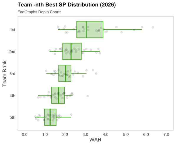 I found every pitcher in the majors projected by FanGraphs Depth Charts to make at least 10 starts in 2026, with greater than 25% of their appearances as a starter. I then ranked all the pitchers in order by projected WAR, and then filtered to include just the top five for each team.