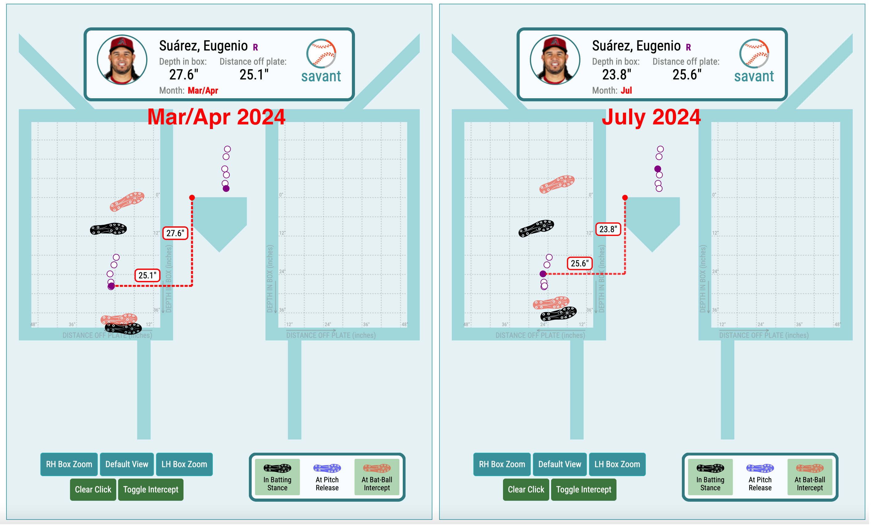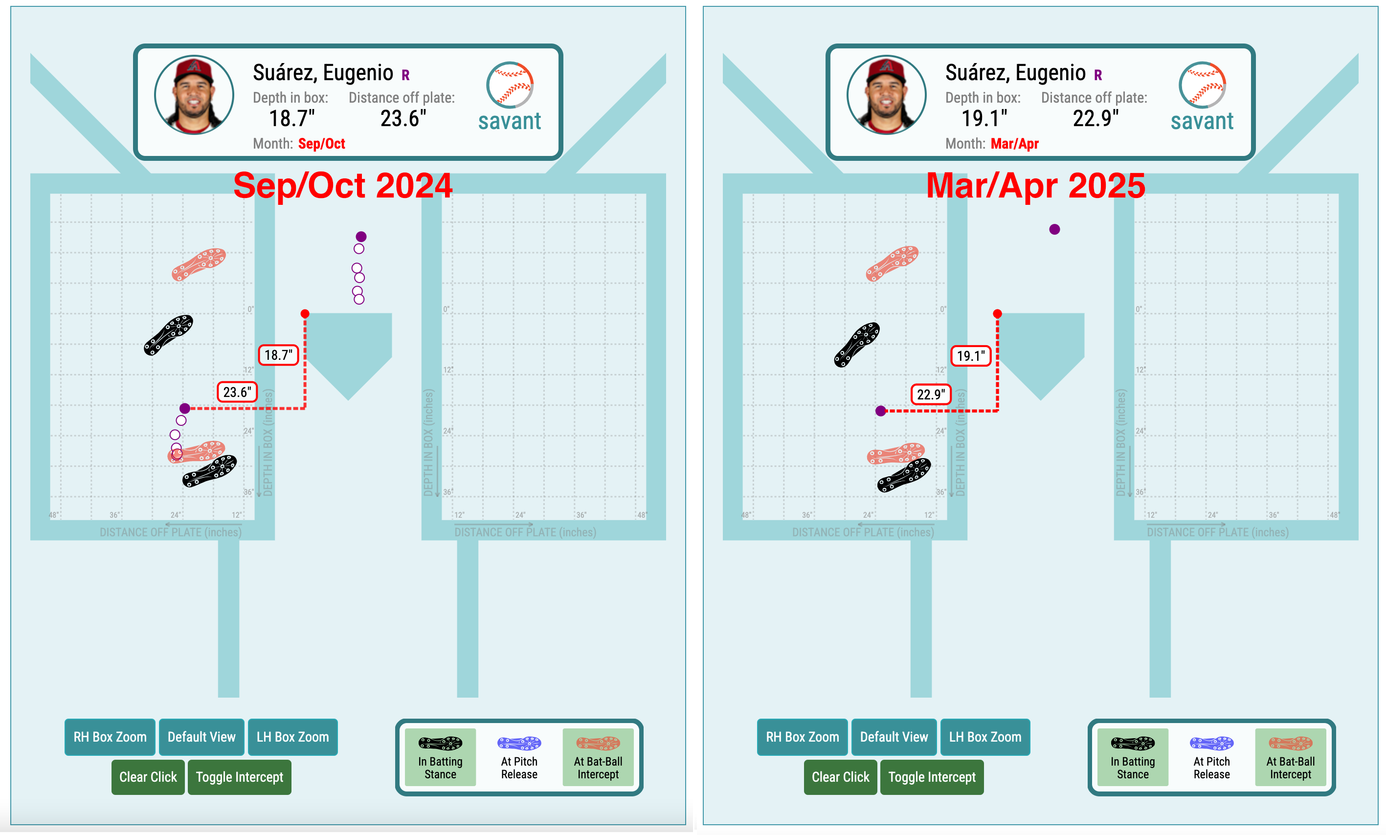 | Season | vs. Front of Plate | vs. Center of Mass | Depth in Box | Distance off Plate | Distance Between Feet | Stance Angle |