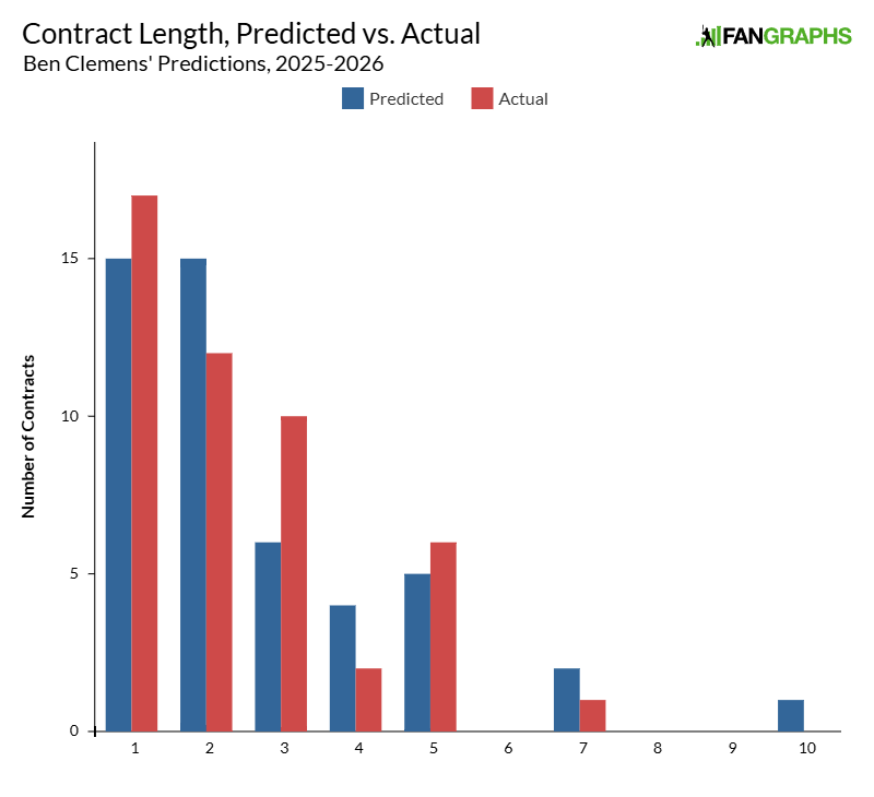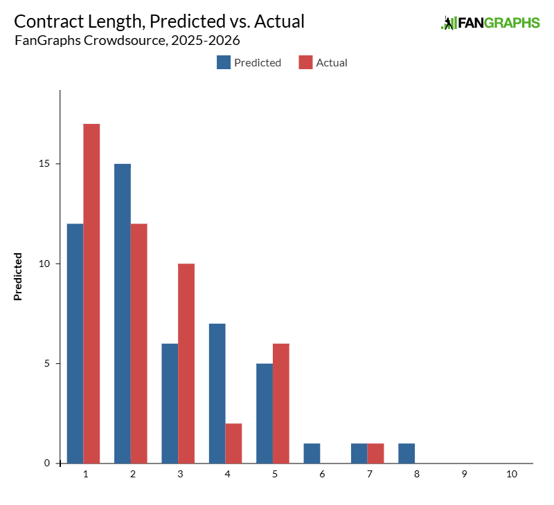 The market for pitchers ran hot early and trailed off. The market for hitters, in contrast, never really got going, with Murakami a key part of that. I tracked five professional prognosticators and the crowd, and your predictions were the only ones that didn’t overshoot. In fact, you and Kiley McDaniel of ESPN were the only groups not to overshoot overall; everyone aside from you, me, and Dupree Kiley was over by $5 million per player or more. In other words, the three prognosticators here correctly judged that the market wouldn’t continue to increase at the rate that it had in recent years.