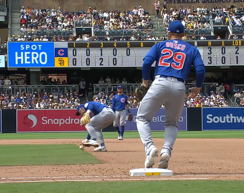 With Tyler Wade running, that would have been a tough play regardless, but Nico Hoerner didn’t have the luxury of a straightforward play. He charged the ball from his initial position, trying for a standard barehanded snag, but with all of his momentum heading toward home plate, he was at an impossible angle for a throw when he reached the ball: