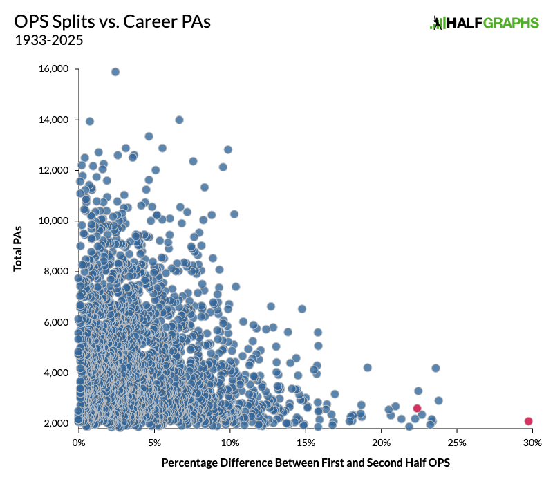 See that red dot all the way out at 30%? That’s Michael Harris II, who has a career wRC+ of 80 in the first half and 134 in the second half. It’s a shockingly huge disparity. In the first half, Harris is barely playable. In the second, he’s one of the better hitters in baseball. Obviously, we’re talking about a small sample here. Harris has played just four seasons, and the biggest statistical difference between his first and second half numbers is a 60-point jump in BABIP. Still, he’s on his own out there. I would bet that things will even out some over the course of his career, but after this start, he’s almost certainly going to end up with a pretty big split whenever he retires. And if this is just what he does every year, I can’t wait to read the 2026 version of the article explaining how he turned things around halfway through the year.