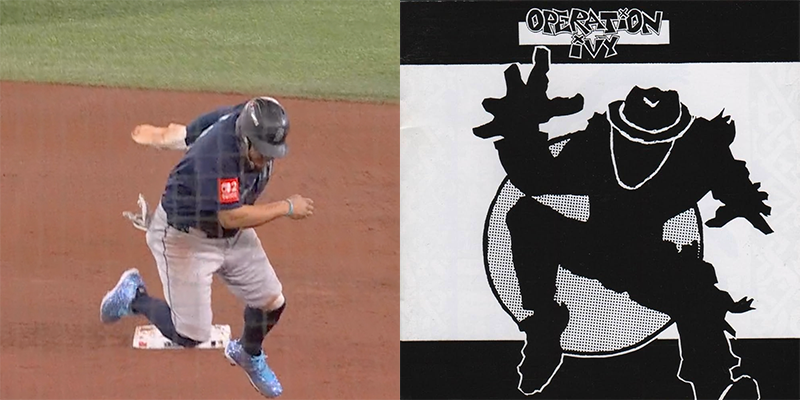 We jump because we don’t know what else to do. This is a normal way to run the bases, right? The game is all of four batters old. You’re headed from first to second. The play’s right in front of you. You’re digging hard, but you’ve got no chance to reach second before the ball does. You don’t even have a chance of getting there in time to attempt to break up the double play. But your shoes are bedazzled beyond all recognition. Might as well jump. Your feet are become dazzle, and they launch you into the air and directly into the path of the ball. You execute a full 180-degree turn, you lower your head, and for a fleeting moment, you look for all the world like the ska man from the Operation Ivy logo.