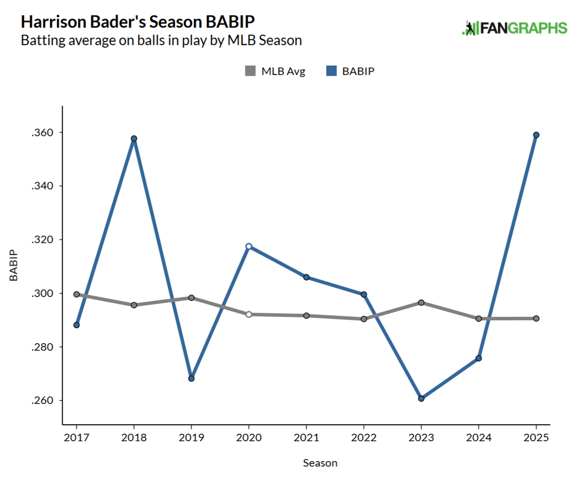 Even with all that taken into account, Bader’s underlying numbers are jumping off the screen waving red flags and flashing alarm bells. He outperformed his xBA by 57 points and his xSLG by 75 points — the second- and sixth-largest overperformances, respectively, of any hitter on Baseball Savant’s leaderboards. If you want to go all the way back to the fluke indicators of the late 2000s and early 2010s, here’s Bader’s BABIP year-by-year: