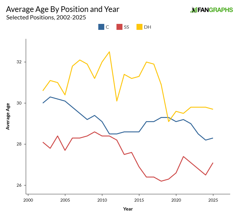 It’s beautiful logic, with just one problem: It’s untrue. Here’s the average seasonal age (as of July 1 each year) of catchers, shortstops, and DHs since 2002, the first year we have positional splits that allowed me to run this analysis: