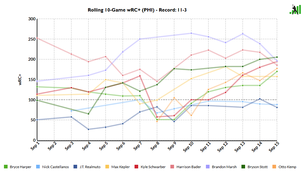 Select any team, any season, and any span within that season. Choose whether you’d like to see the nine most-frequent batters, or everyone who appeared in that timeframe. The table view will show you the daily performance of those players in that span, and it helpfully displays the team’s record over that timeframe as well. The graphical view displays 10-game rolling averages for one of a number of available statistics: