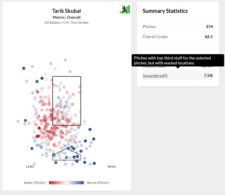 PitchingBot is a phenomenal tool, and it’s one we haven’t made enough use of. This is the start of us trying to fix that. The model operates on a per-pitch basis, grading every offering a pitcher throws on three axes: stuff, command, and overall. We aggregate that pitch-level data up to a single grade by default – but we don’t have to. This tool instead lets you graph each individual pitch matching a set of criteria – pitcher, pitch type, count, and batter handedness – on any of the three metrics. The pitches are shaded based on their grade. We used the generally accepted heat map scale — red for good and blue for bad — even though Ben’s personal view is that green is good and red is bad. Such is life.