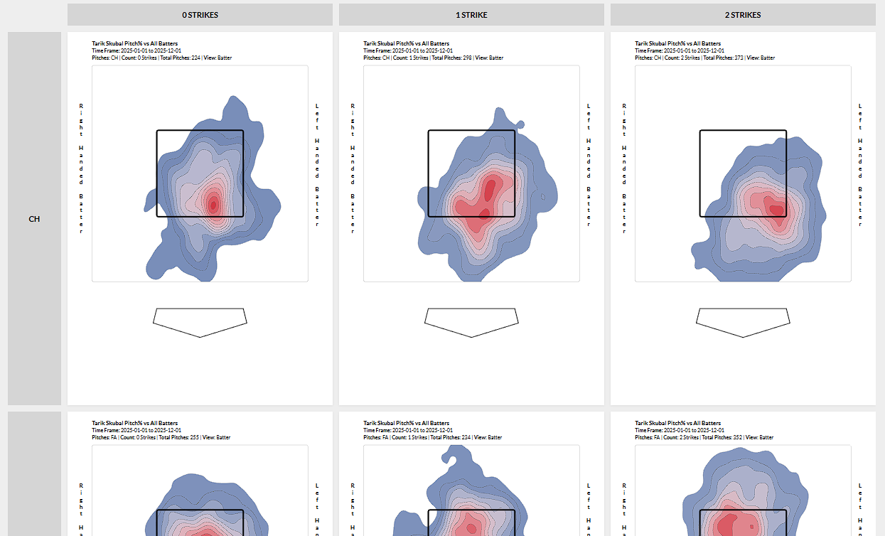 If you can think of two variables, the Heat Maps Pivot can create a grid of all the different combinations of them. How does Tarik Skubal change the location of his changeup as he gets more strikes in the count? You can graph it. You can graph how he changes each of his pitches by count, or by batter handedness, or even by time frame: