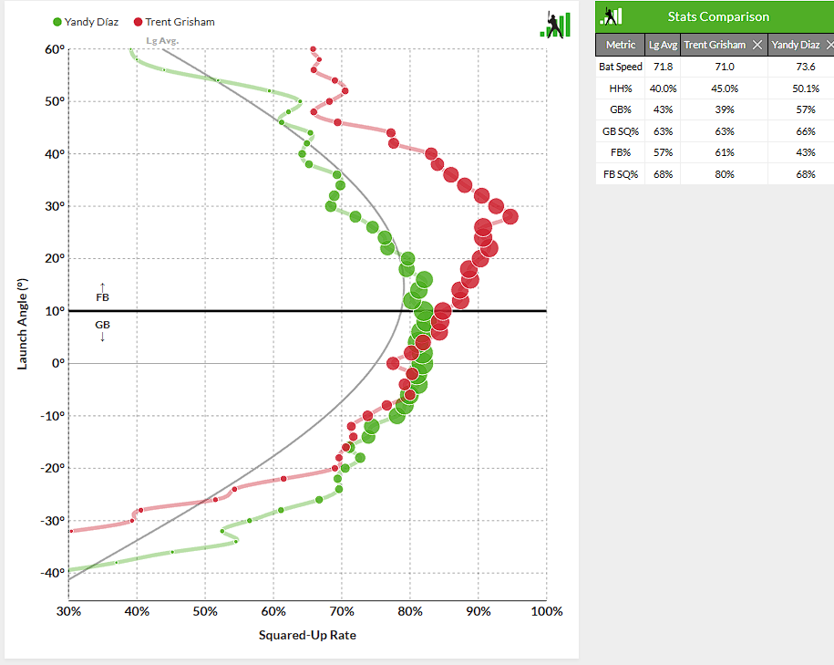 Different swings square the ball up best at different launch angles. Yandy Díaz and Trent Grisham square the ball up at similar rates, but they don’t do it the same way. Díaz’s swing squares the ball up most frequently when he hits it low; Grisham gets flush contact when he puts it in the air. This tool lets you visualize that difference by graphing squared-up rate against launch angle, showing where different hitters make their purest contact: