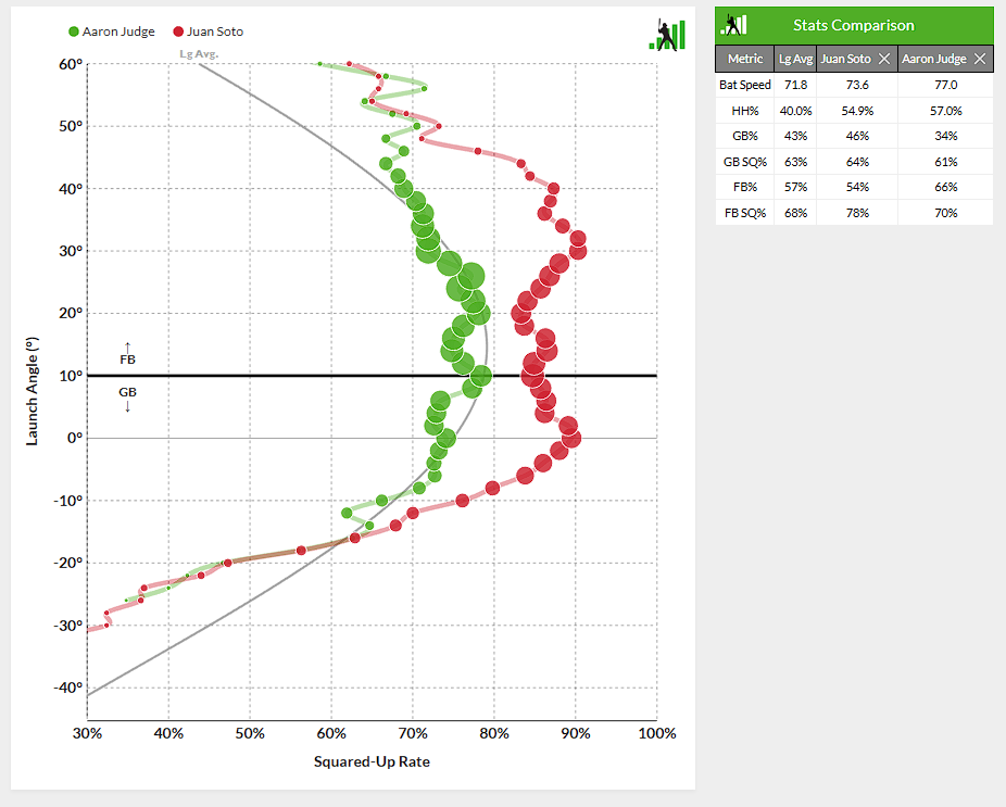 Each circle represents how frequently a batter squares up their contact for a given launch angle. The size of the circle is proportional to how often the batter hits the ball at that given angle. That’s how you can tell that Soto hits the ball squarely at all angles, while Aaron Judge’s most frequent contact, and most squared-up contact, is in the air: