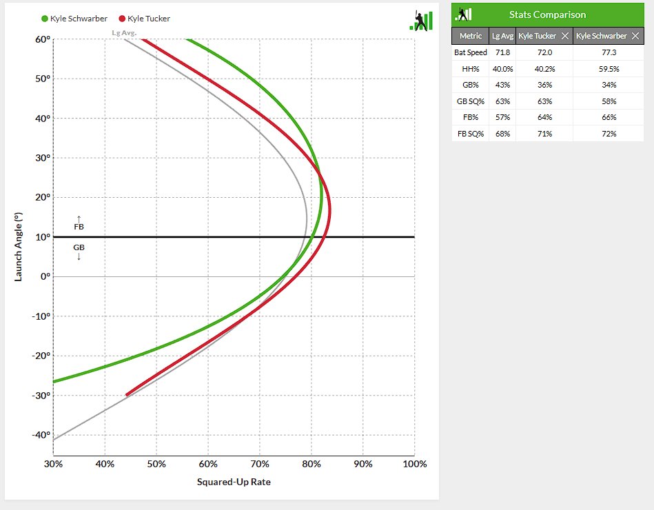 You can also see how those hitters compare to league average. Naturally, the overall population of hitters squares the ball up most frequently when they’re hitting line drives. If you’d like, you can graph individual players using the same smoothed curve. Kyle Schwarber and Kyle Tucker have each optimized their swings. Schwarber makes frequent squared-up contact at high launch angles, while Tucker rips line drives and low fly balls: