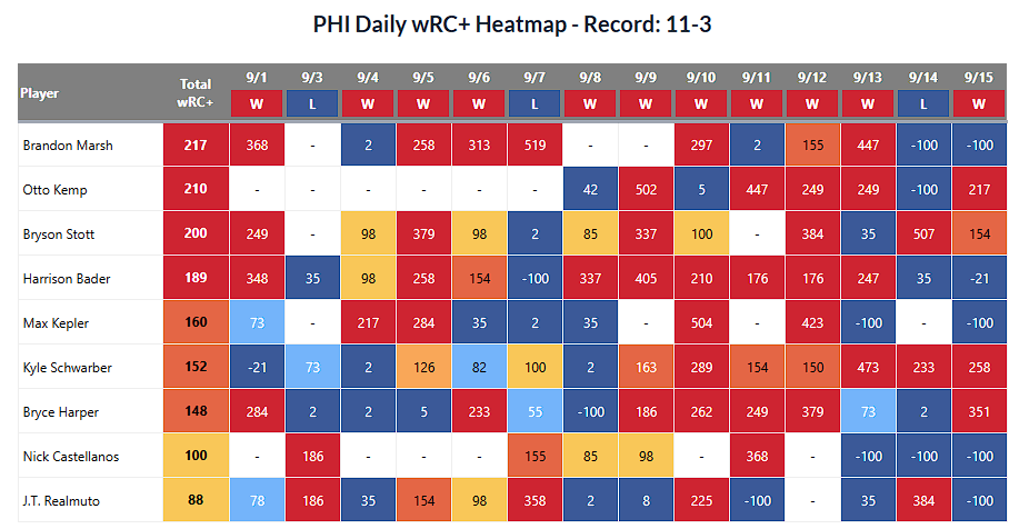 This tool comes from the mind of Jason Martinez, with Ben executing the design. Sometimes aggregate statistics don’t tell the story of how a given stretch of the season actually went. A 150 wRC+ over a week of play could mean a hitter is consistently getting on base – or that they had a three-homer game and then a bunch of zeroes. This tool disaggregates those numbers by showing the day-to-day performance of the entire lineup in one graphic: