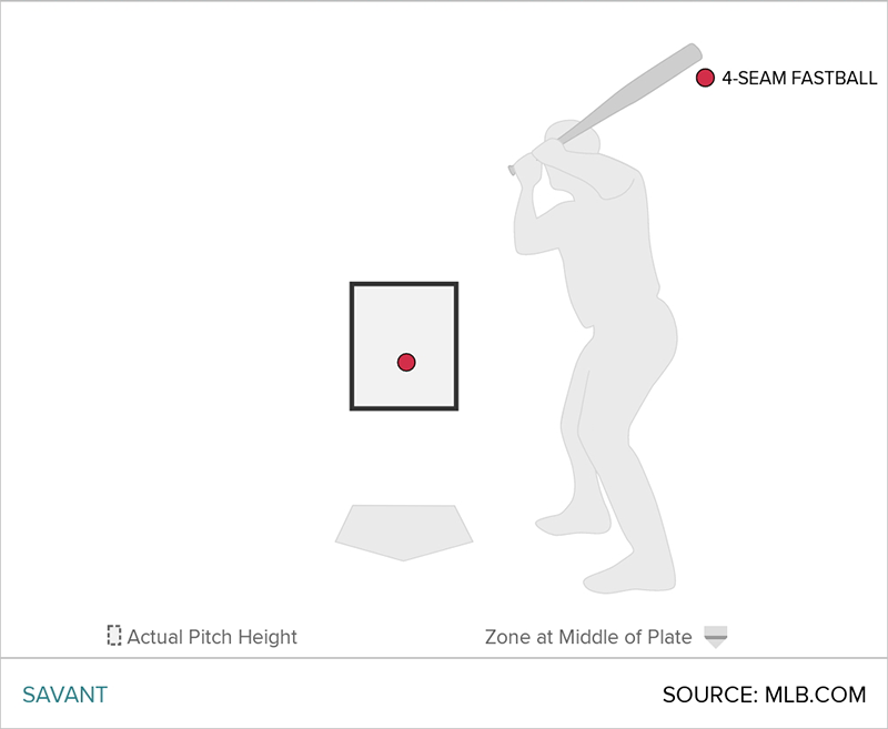 In a way, this almost qualifies as a success for Díaz, whose command has been his biggest issue as a prospect. His Location+ was also right at the bottom of the majors last year, but that right there is a perfect draw right to the button. It’s a four-seam fastball, mid-(gigantic)thigh, directly over the center of the plate. It’s the platonic ideal of a meatball. This is what it looks like when a baseball is begging to be put out of its misery. I’m surprised that little red dot isn’t holding a little sign that says “YIKES!” like Wile E. Coyote.