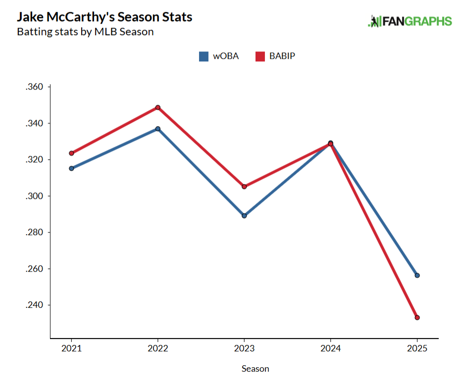 McCarthy has had two good seasons in the major leagues: In 2022, he hit .283/.342/.427, for a 116 wRC+, and 2.2 WAR in just 99 games. In 2024, he hit .285/.349/.400 with a 110 wRC+, which came to 3.0 WAR in 142 games. In both of those seasons he had a high BABIP and bested his xwOBA by an appreciable — but not outrageous — margin.