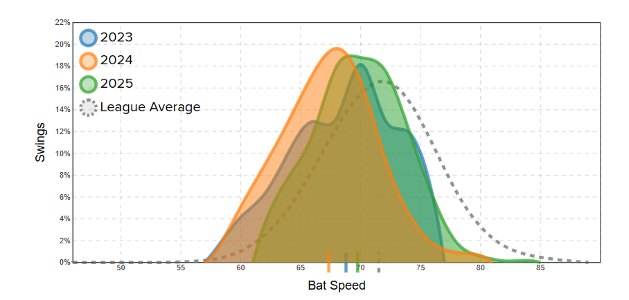 But in 2025, that ratio rose to more than five-to-one, and he actually hit more batted balls that got flagged as weak contact and fewer balls in the air to the pull side.
