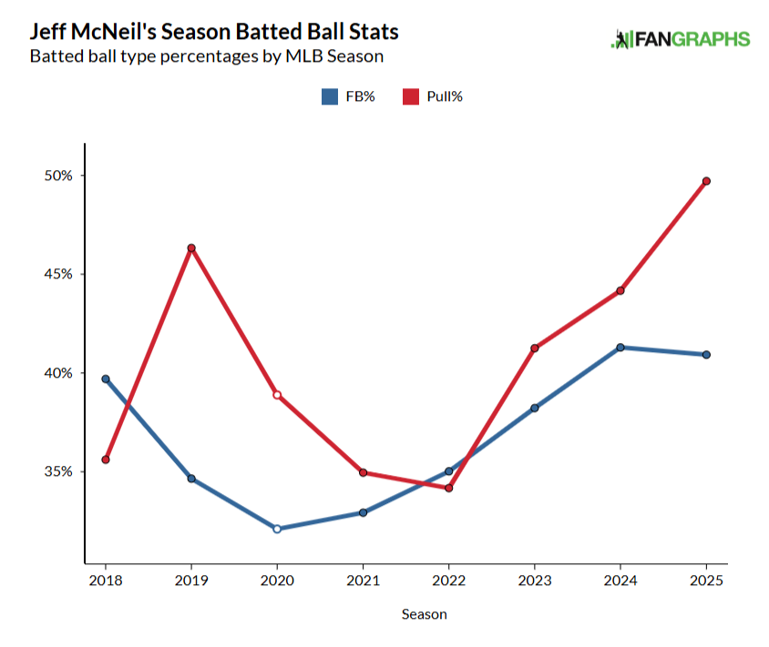 In 2023, the first season for which Baseball Savant has bat tracking data, McNeil had an average swing speed of 68.1 mph and a fast-swing rate (bat speed of 75 mph or more) of 2.6%. For context, that’s eighth-percentile bat speed. In each of the past two years, his swing has gotten longer and more forceful, and he’s letting it eat on a greater percentage of his swings. In 2025, McNeil’s average swing speed climbed to 70.7 mph (still only 27th percentile, but faster than it was before), with a fast-swing rate of 10.2%.