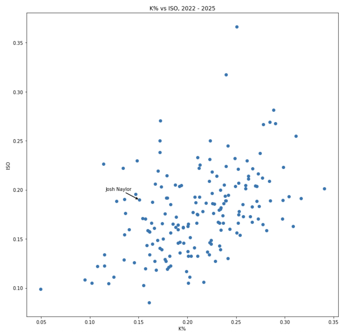 While Naylor’s connection with Tucker is heartwarming, it probably wasn’t sufficient to merit what seems likely to be a nine-figure deal. Helpfully, the signing also manages to make good baseball sense. Between Raleigh, Randy Arozarena, and (until this season) Julio Rodríguez, the offensive core of the club features a healthy amount of swing-and-miss. Naylor’s high-contact approach lends balance to a lineup that has suffered through spells of being overly reliant on the long ball. Since he started earning regular playing time in 2022, Naylor’s 15.1% strikeout rate ranks among the stingiest in baseball; his 13.7% K rate in 2025 sat in the 91st percentile. And unlike most other low strikeout hitters, Naylor can launch a tank every now and again. While it’s hard to see him matching his 31-homer peak from 2024, there’s enough pop in the bat to boost his isolated slugging to respectable levels, rounding out his offensive game: