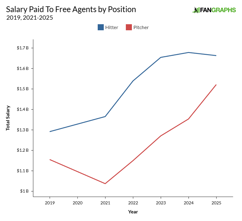 As an aside, I only pulled data through 2019 because it’s outrageously difficult to get complete salary data. If you’re looking for Opening Day annualized salaries, sure, those are reported. If you’re looking for free agency contracts, again, pretty easy to find. There are no disputes about what Freddie Freeman’s salary was in 2025; it’s public record. But what about Freeman’s former teammate Justin Dean, who racked up 52 days of service time in his debut season? What about split contracts? Late debuts? Up-and-down types? I worked out a method for what I consider a very good approximation of those salaries, but I don’t feel confident going back before the start of RosterResource’s database, which begins in 2019. Even then, this is approximate, though as I mentioned, I’m confident that it’s a good approximation.