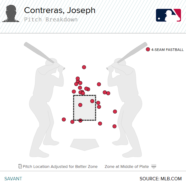I want to give a particular nod to Joseph Contreras, son of Jose Contreras. He’s a Georgia high schooler and Vanderbilt commit eligible for the 2026 draft. He played for Team Brazil and dialed up some of the highest-octane stuff in the entire tournament. Just one problem: He couldn’t get anywhere near the strike zone. Here’s a shocking graph of his four-seamer locations: