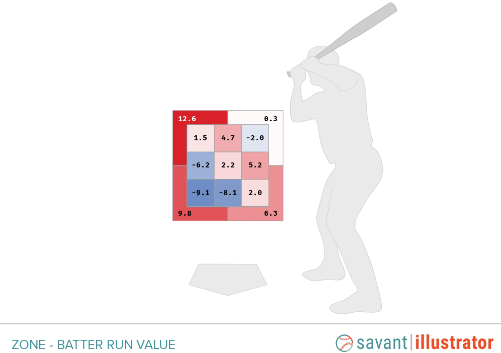 Because we are not Ben Clemens, we’re going to focus on down and away today, and we’re going to focus on batters. As you can see from Judge’s heat map, bat speed tends to be slower down there too. We’re no longer just talking about getting your arms extended. You have to modify your swing to reach pitches that far away, bending and reaching, slowing down your bat because the optimal contact point is deeper. If there’s one thing we’ve learned from bat tracking data, it’s that those kinds of adjustments make you hemorrhage bat speed. Low and away is also where trickier pitches like offspeed and breaking balls tend to end up. Nobody is good against those pitches, and I do mean nobody.
