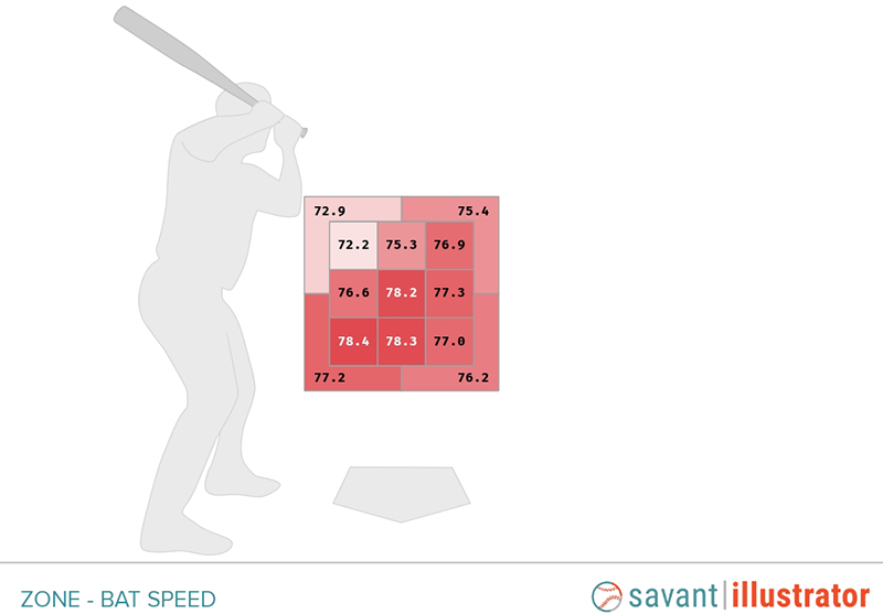 Pitchers have been throwing hard stuff up and in for as long as they’ve been throwing hard stuff, but Statcast’s new bat tracking data allowed us a new peek at why that’s such a successful game plan. The heat map for bat speed below is extra red because it belongs to Aaron Judge, but insofar as the least red spot is the high-inside strike, it might as well belong to any hitter.