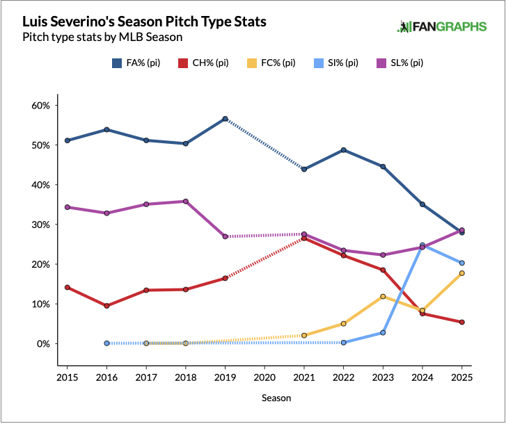 Now, maybe these tradeoffs are worth it. It’s not entirely fair to compare Severino in 2025 to himself from seven years ago. It’s possible that continuing to throw the same three-pitch mix wouldn’t have the same effect today as it did when he had that extra, tip-top gear. But the sum total of these changes is a slower, more contact-oriented approach. Severino last year struggled to get ahead in counts and finish off batters.