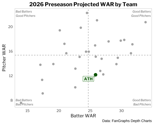 Their pitching is bad. They finished last year in the bottom five by WAR, and we project them no better in 2026: Their starters ranked 24th in our positional power rankings, while their bullpen ranked 26th. I don’t know that I’d call them terrible — they’re still a clear rung or two above the Rockies — but there’s not much there to distinguish them.