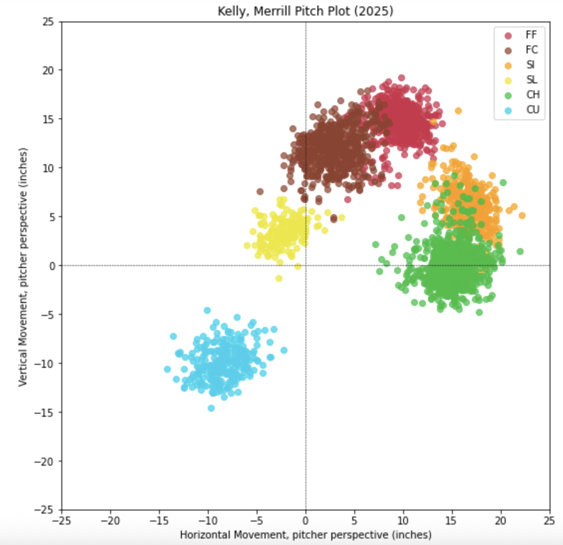 Even the cutter moves arm side (and, it should be noted, performed spectacularly in 2025, allowing a .262 xwOBA on contact with equal usage to both righties and lefties). Kelly’s primary pitches — save for the changeup — all move in a similar tunnel.