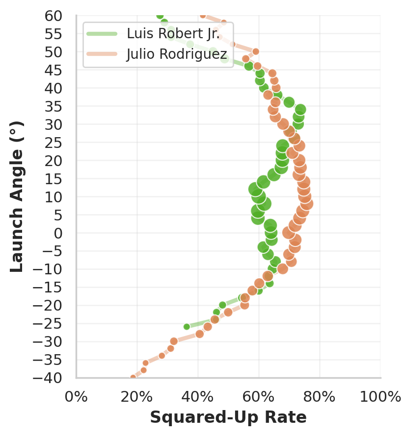 This little tool I’ve been working on isn’t ready for primetime yet, but I think it’s a great way of explaining what’s happening here. The x-axis is the percentage of batted balls at a given launch angle that are squared up – hit right on the nose, at 80% or more of their theoretical maximum speed given how fast the bat and the ball are traveling. The size of the circles represents how often the hitter hits a ball at that particular launch angle. Like his fellow powerful center fielder Julio Rodríguez, Robert squares the ball up somewhere between 60% and 80% of the time when he’s not hitting it straight into the ground or straight into the air. But he hits a ton of balls at unthreatening angles, from -5 to 15 degrees, and he’s not even squaring those up all that well. His purest contact is in a great home run band, 30 to 35 degrees, but he very rarely reaches those heights. In fact, he squares up fly balls less frequently than Rodríguez does despite hitting them more often. In other words, his swing isn’t doing the thing you’d want it to do — hit the ball hard in the air — even though he often hits the ball hard, and also often hits the ball in the air. It’s mismatched.